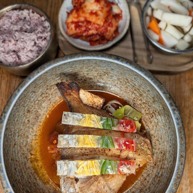 Steamed bottle fish, winter melon, leeks, tofu in spicy broth, purple rice, green salad and kimchi.